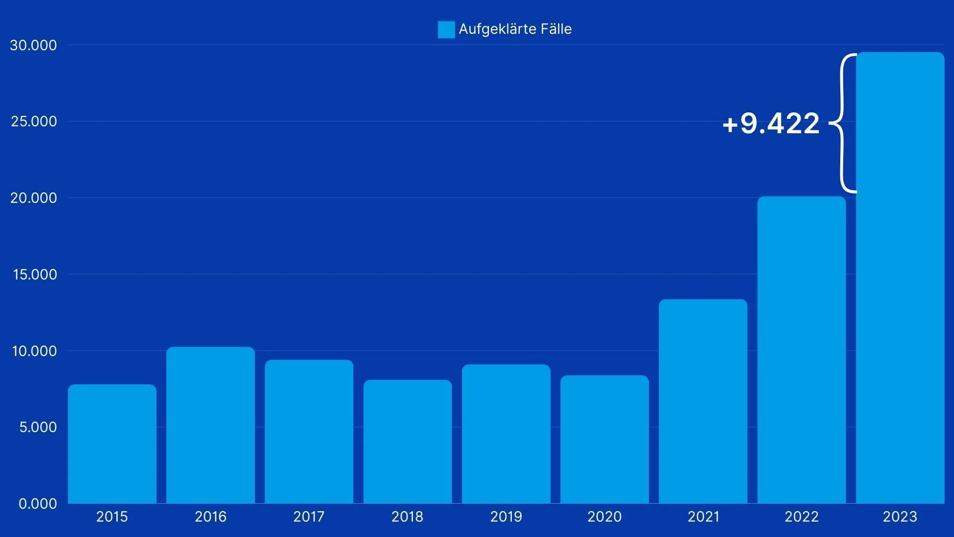 In diesem Zusammenhang erfreulich hingegen, ist die steigende Aufklärungs-Quote. Von den erfassten Fällen wurden 29.518 aufgeklärt – im Verhältnis zu 20.096 im Jahr 2022. In absoluten Zahlen also 9.422 Fälle mehr als im Vorjahr.