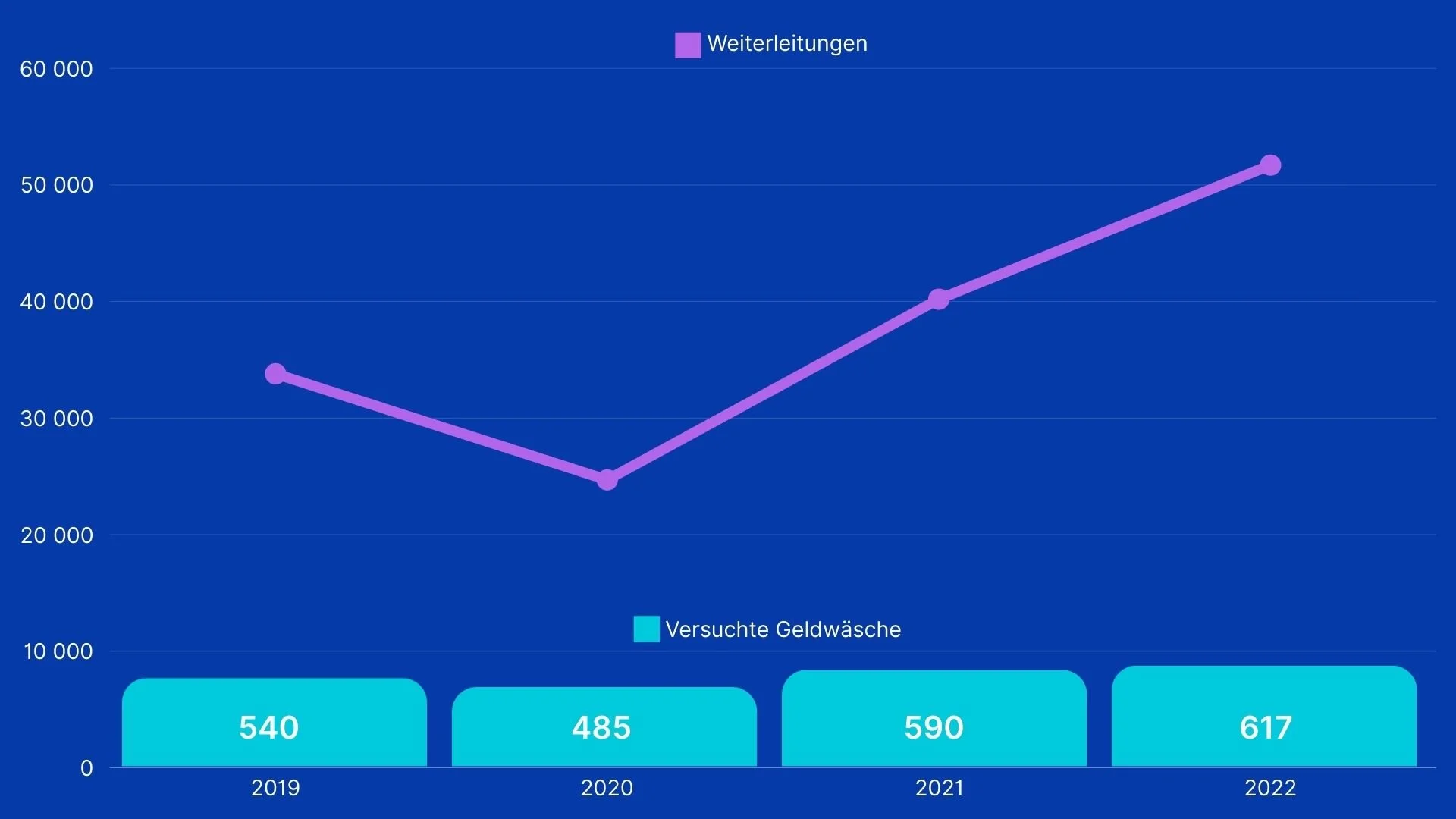 Die öffentlich zugänglichen Zahlen von 2019 bis 2022 zeichnen ein anderes Bild. Nur ein kleiner Teil der abgegebenen Verdachtsmeldungen landet am Ende auch bei der Strafverfolgung. Und dieser prozentuale Anteil schrumpft seit Jahren.
