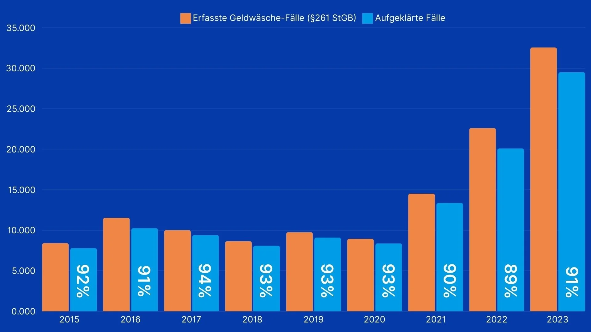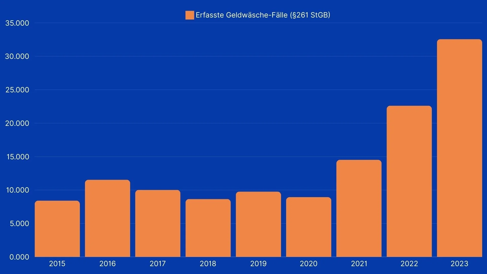 Die durch das Bundeskriminalamt erfassten Geldwäsche-Fälle im Jahr 2023 haben einen neuen Rekord gebrochen. Insgesamt erfasste das BKA 2023 32.573 Fälle von Geldwäsche (§261 StGB). Das ist ein Anstieg von 44 % (22.614).
